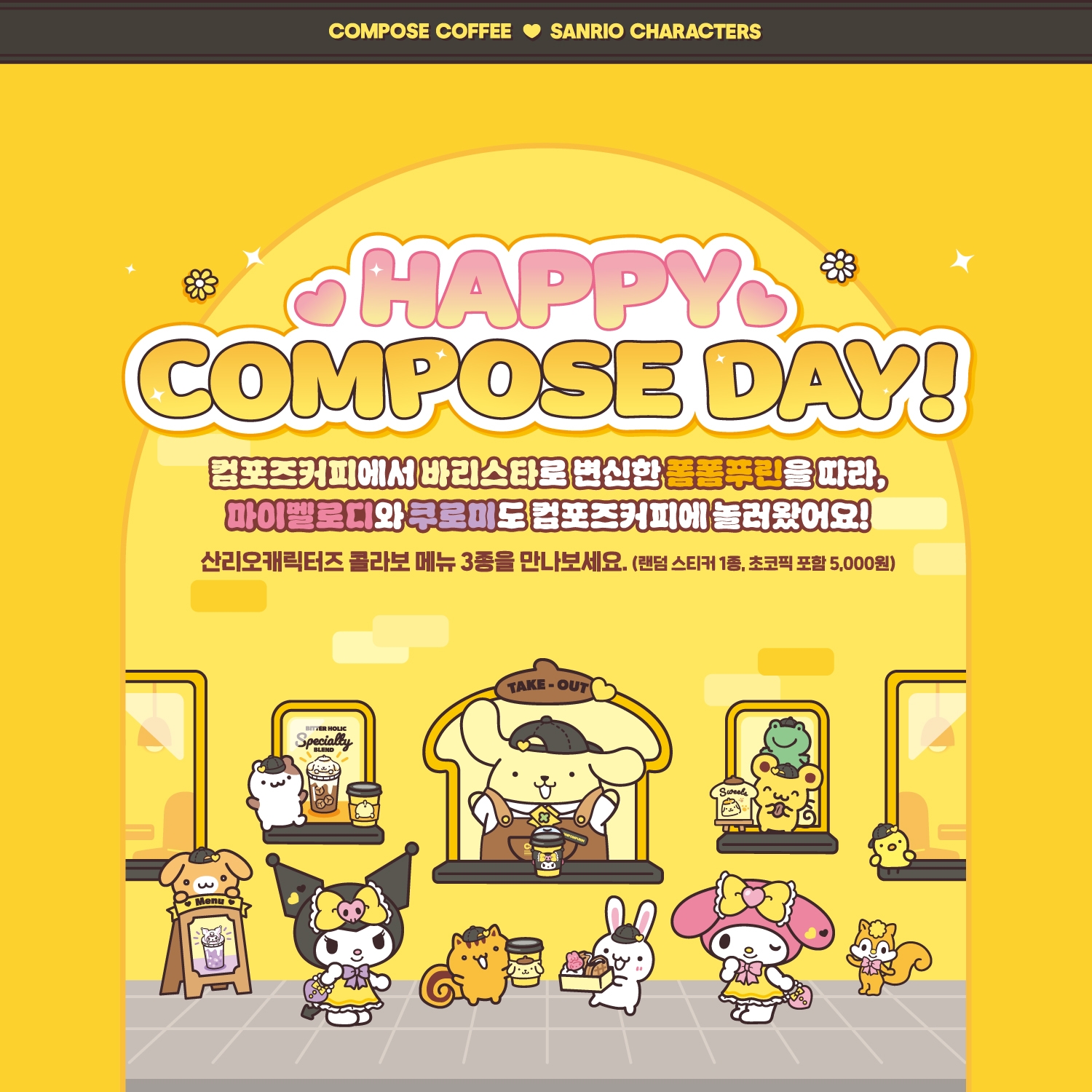 🚨[속보] 오늘 출시!🚨 드디어 기다리고 기다리던컴포즈커피와 산리오의역대급 콜라보가 시작되었습니다! 마이멜로디 탄생 50주년과 쿠로미 20주년을 기념해,폼폼푸린이바리스타로 일하는 컴